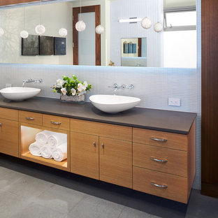 Floating vanities with vessel sinks are perfect for nailing a modern look. On the other hand, a freestanding reclaimed wood base will give your bathroom a rustic appeal. For a contemporary look that's somewhere in the middle, look for a vanity with a smooth wooden base and a pearly white vessel sink. Floating vanities can come in single or double sink installations to accommodate both small and large bathrooms and can also be purchased without tops. Floating vanities do not skimp on storage space. You can find many products that come with an abundance of drawers and doors to meet