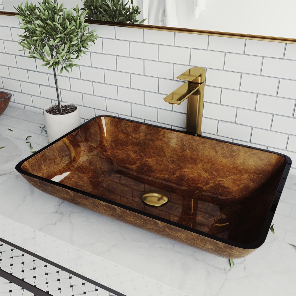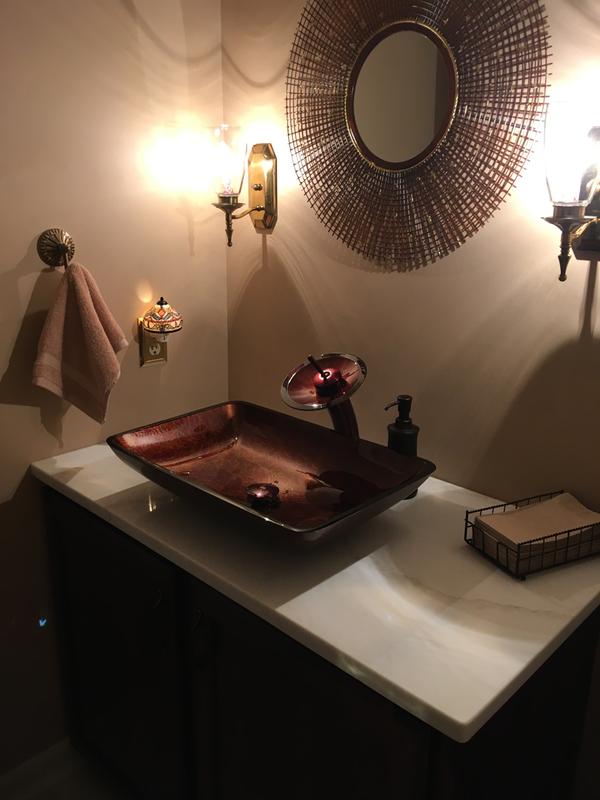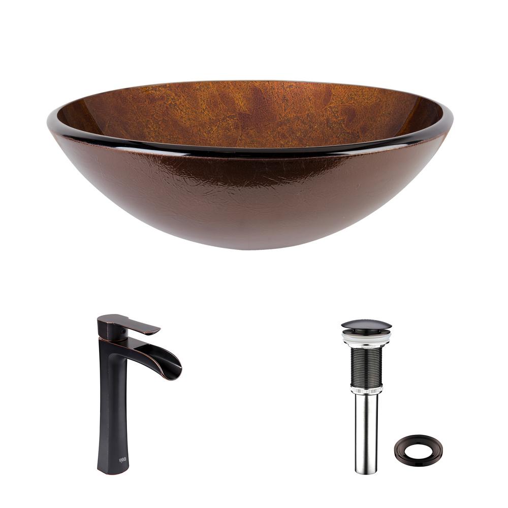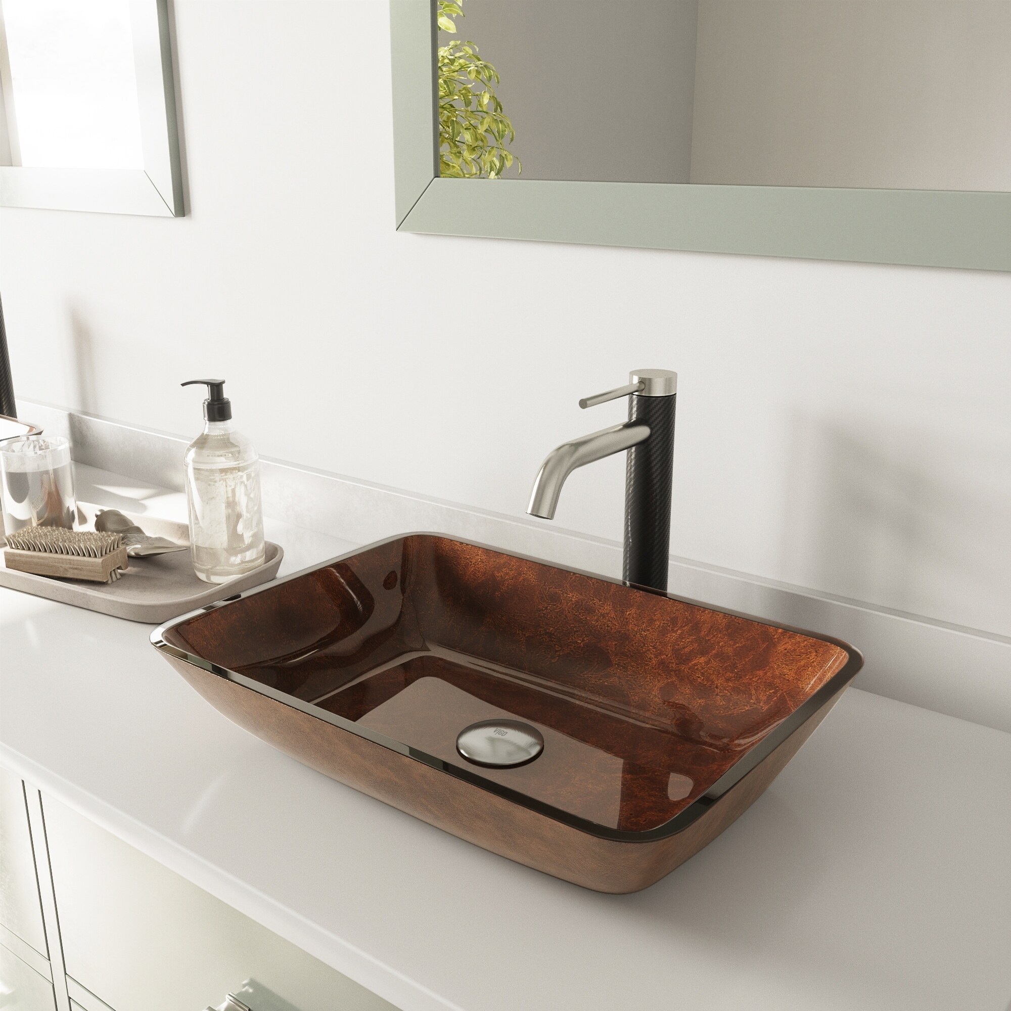 See our disclaimer. The Vigo Glass Vessel Bathroom Sink, Russet features the perfectly combined colors of brown and orange to provide an exciting I purchase the simply silver glass vessel sink and Niko waterfall faucet for a small en-suite bathroom. As soon as the packages arrived I knew this was a... Vigo Walnut Shell Brown Tempered Glass Above Counter Vessel Sink. 816686012110. Amber Sunset Multicolor Vessel Sink with Brushed Nickel Faucet. Rectangular Copper Vessel Sink and Fountain Faucet. 813775011115. Russet Waterfall Glass Sink and Faucet Set. Glass Bathroom Vessel Sinks. Looking for a unique vessel sink but don't want to